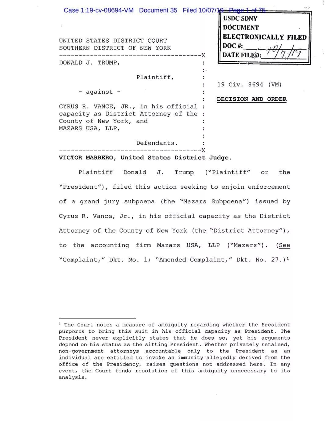 2019年11月4日,美国第二巡回上诉法院作出判决,特朗普总统的会计师事务所必须将他8年的个人和公司纳税申报表交给曼哈顿检方。本案合议庭为:首席法官Katzmann, Denny Chin 和 Christopher F. Droney。Katzmann由克林顿总统委任。后两名法官由奥巴马总统委任。