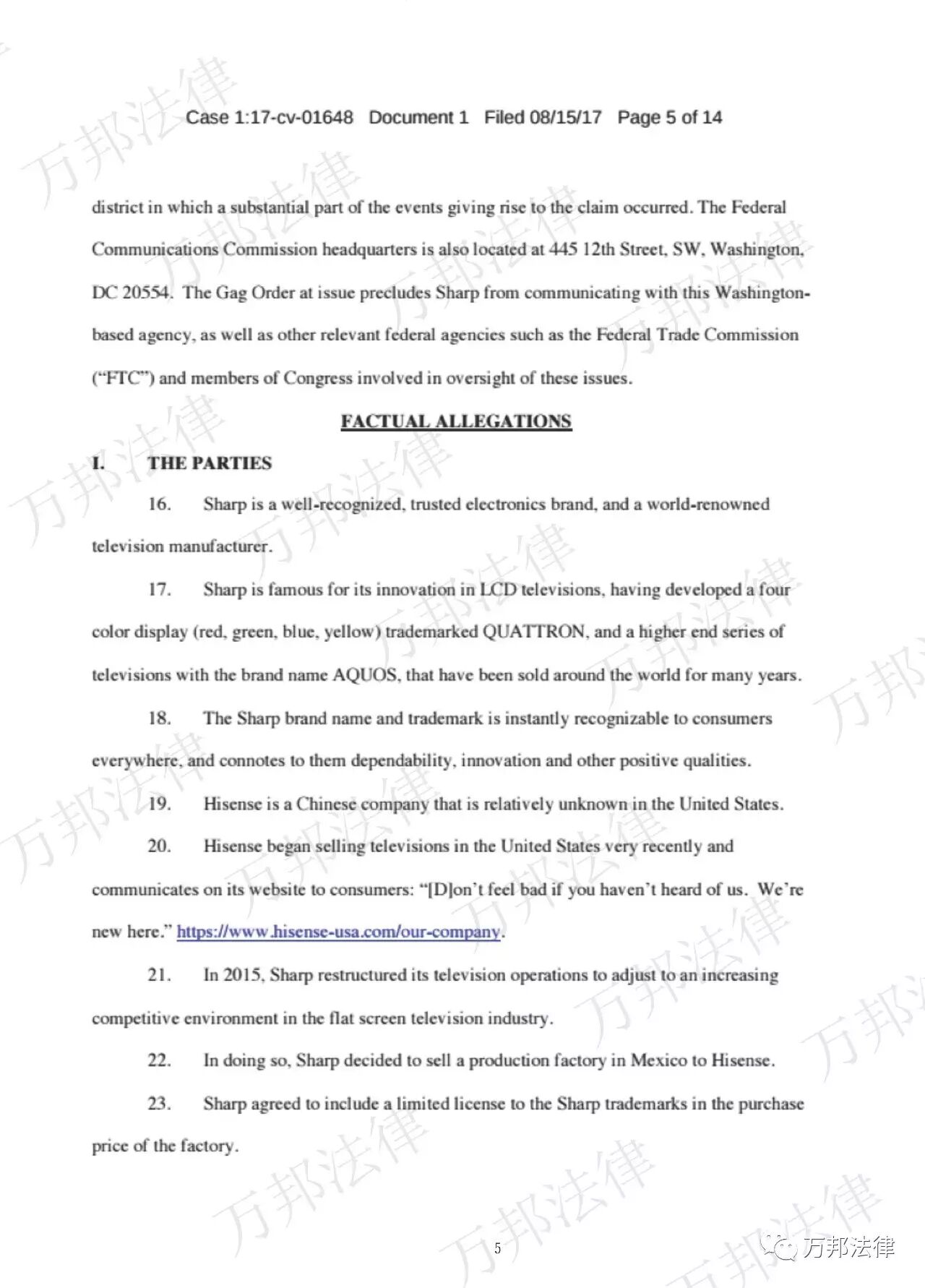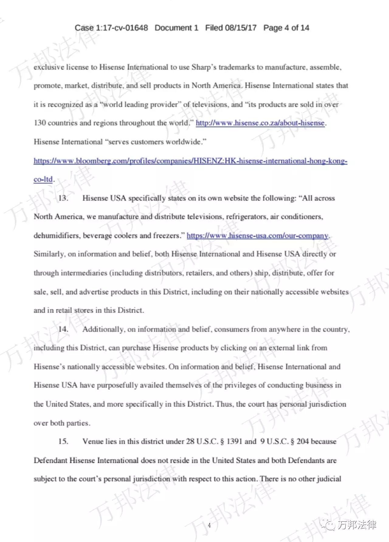 3. 在管辖理由中,夏普将海信美国和海信国际被列为共同被告,以其在美有经营活动,主张美国法院对其有属人管辖权。夏普还主张,联邦通讯委员会位于华盛顿,所以应由哥伦比亚特区地区法院管辖。