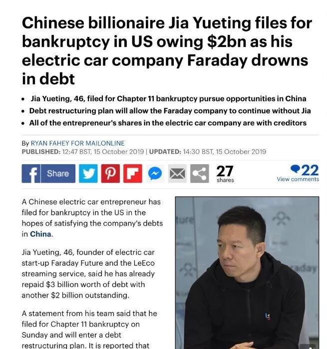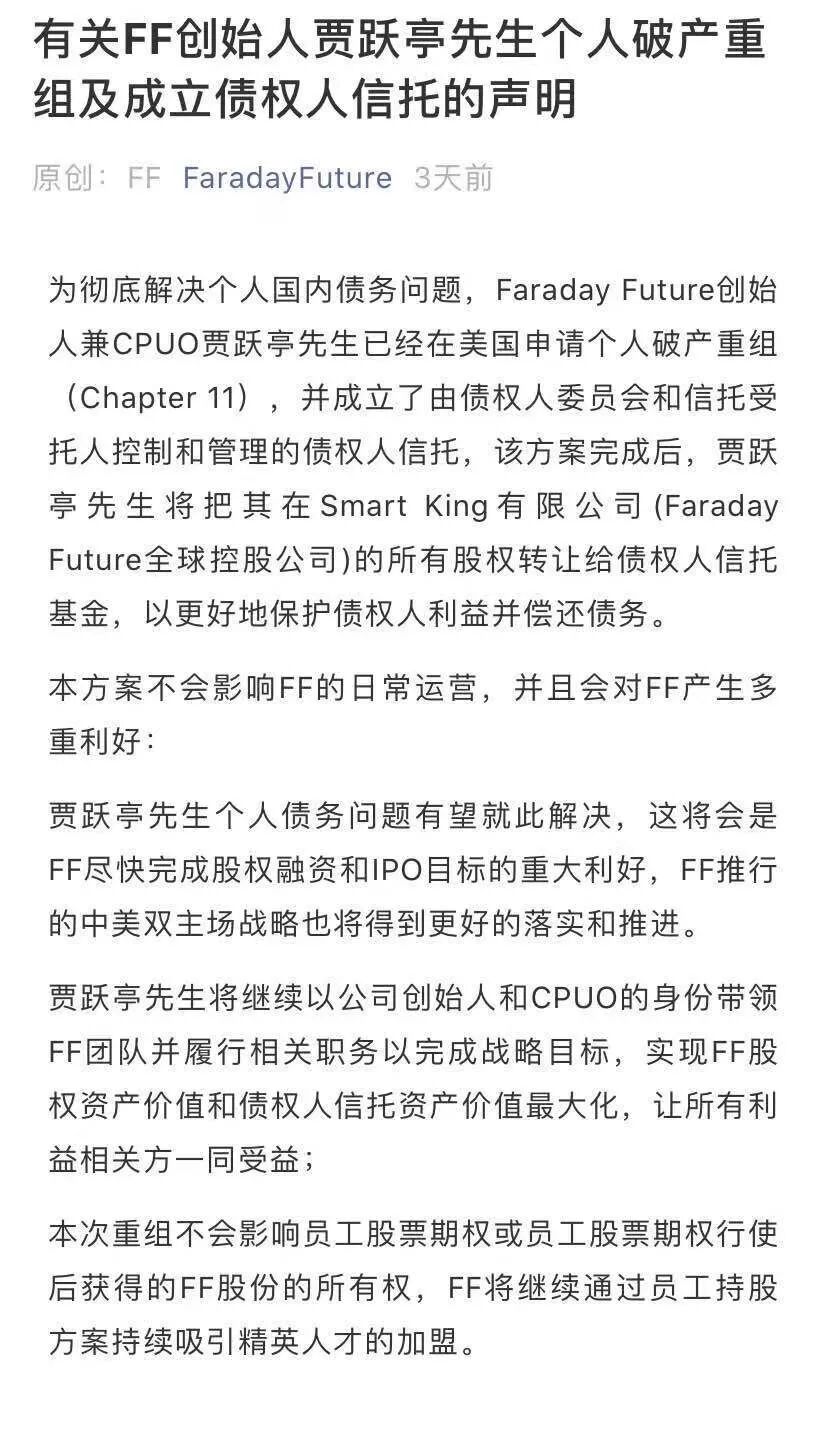 美国当地时间10月13日,贾跃亭根据美国破产法第11章规定,向美国破产法院主动申请个人破产重组,计划设立债权人信托,并放弃他在Faraday母公司Smart King Ltd.的股权,以帮助偿还债务。