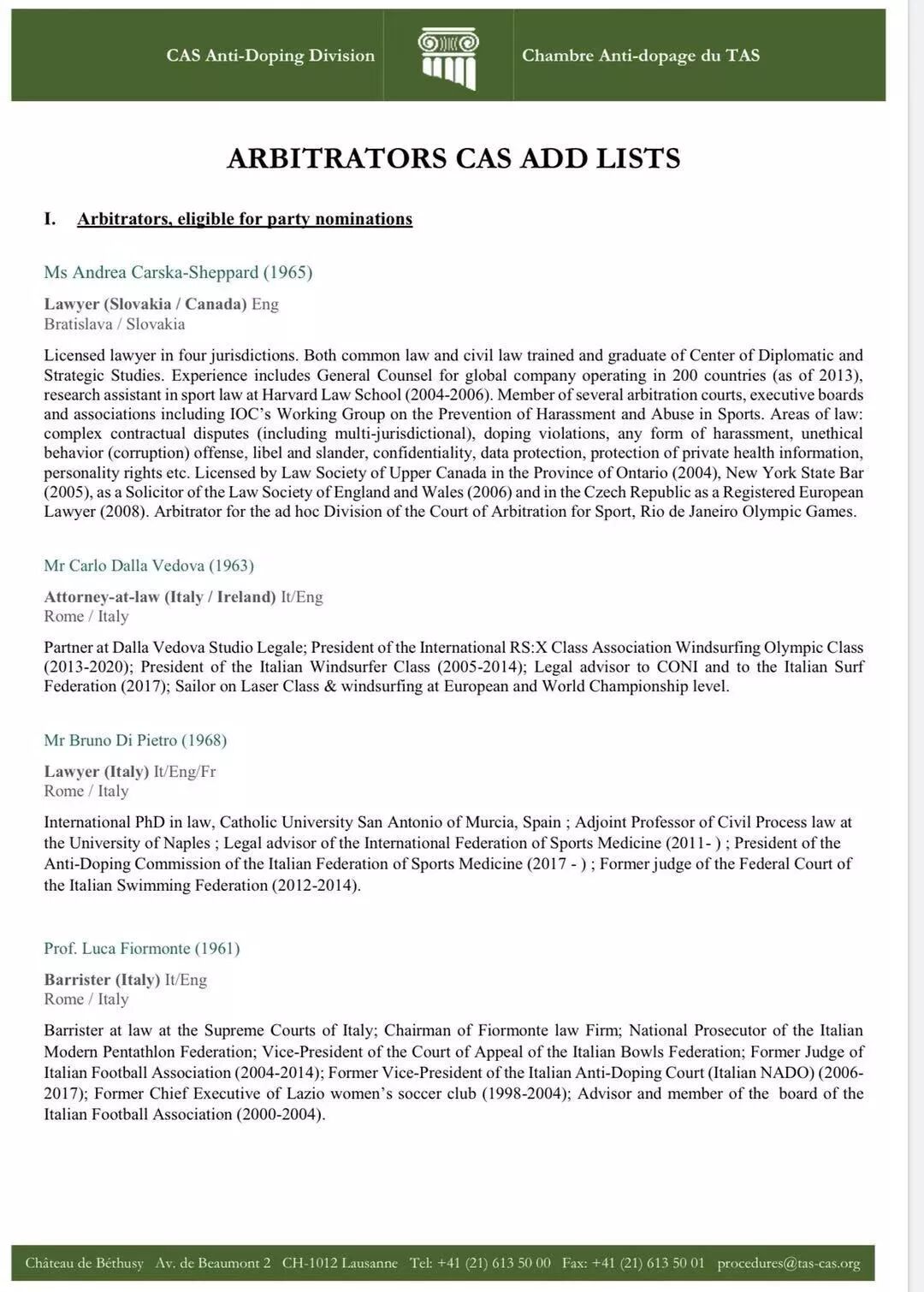 其中,李智教授同时出现在CAS仲裁员和反兴奋剂庭仲裁员两个名单里。